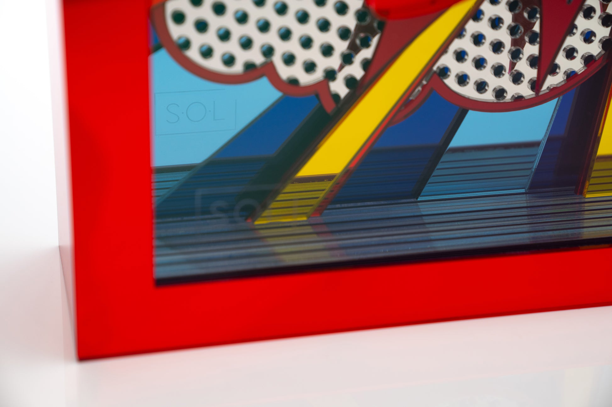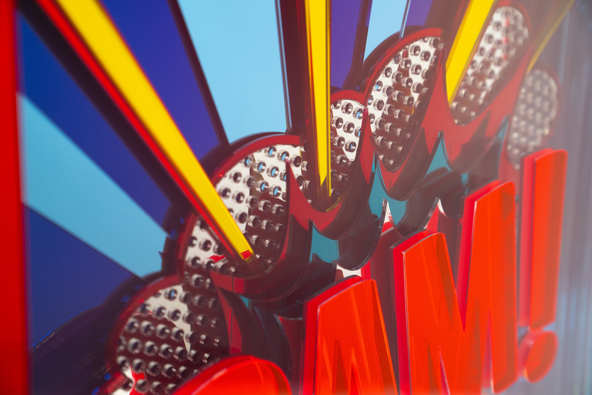 teal, silver mirrored and red neon acrylic.